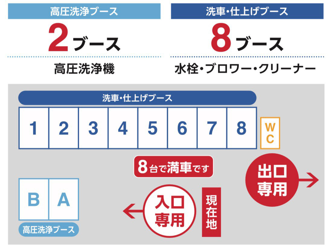 Aまずチケットをとって入場いただき、高圧洗浄ブースで洗浄してください。その後、仕上げブースで拭き取りをお願いします。